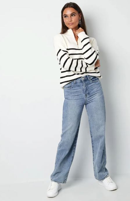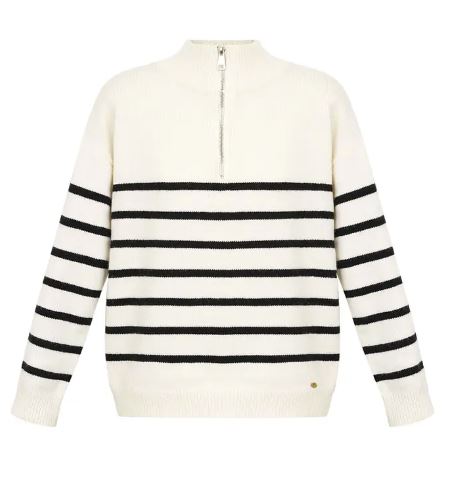 Entdecke den perfekten Look für jeden Tag mit dem gestrickten Pullover mit Streifen und Reißverschluss in Schwarz und Weiß. Sein zeitloses Design und seine schmeichelnden Passform machen ihn zu einem echten Gewinn. Stylisch und bequem - dieser Pullover ist ein Must-Have!